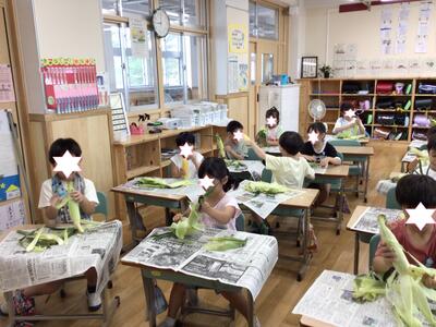 給食で使うトウモロコシの皮を2年生がむきました。全校の分を準備します。冷凍のコーンは知っていても生のトウモロコシを見たことのない子もたくさんいて、ひげがきもちいい!つるつる!と喜んでいました。今日の給食に間に合うように一生懸命むきました。むいたあとは給食室にはこんでいきました。給食が楽しみです。