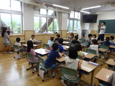 2年1組を会場に市内の小学校の教職員が集まって授業研究会が行われました。学級活動「げんきだまをつくろう」のめあてのもと、どんな言葉遣いをするとみんなが気持ちよく過ごせるかを話し合いました。小グループで考えを交流した後、学級全員の前で発表をしました。たくさんの人に見られていましたが、最後まで集中が途切れずに、活発に話合いが進んでいきました。よりよい人間関係を形成していくために、どのような授業を仕組んでいくことが必要なのか。その後の研究会でも積極的に意見が交わされました。