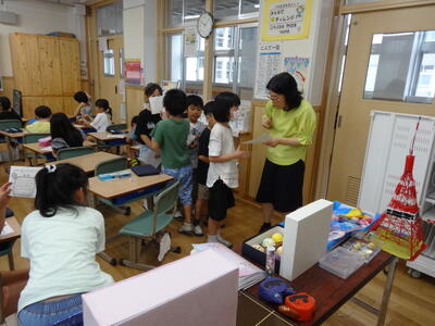 今日から夏休みの自由研究の作品展が始まりました。おうちの方も夕方からこられますが、2年生は一足早く見に行きました。 「おにいちゃんのさくひんみつた!」「これはどうなっているのかな?」と興味津々。1つ1つ見ていきました。