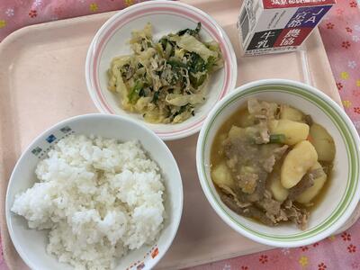 今日から給食が始まりました。4月最初は肉じゃがでした。
