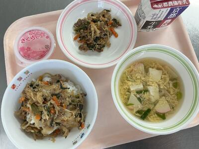 牛丼ですが、切干大根やほうれん草などの野菜がたくさん入った牛丼です。