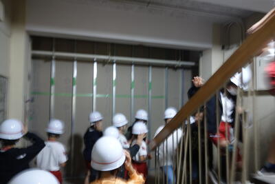 5年生では、総合的な学習で校舎改築について調べています。今日は、改修工事中の教室の様子を見学しました。まず、グラウンドで業者の方や市の方に挨拶をし、現場に入るための注意点を聞きました。そのあといよいよ体験です。