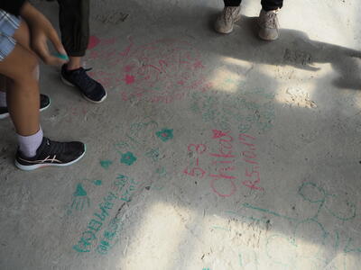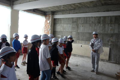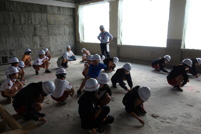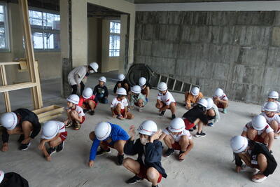 子どもたちは壁や床が剥がされた状態に驚きつつも、新しくできる教室に期待を膨らませ、自分たちの教室の床にチョークでメッセージを書きました。この見学を通して、多くの方々が校舎改築に携わっていることを改めて感じていました。