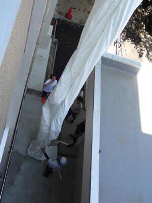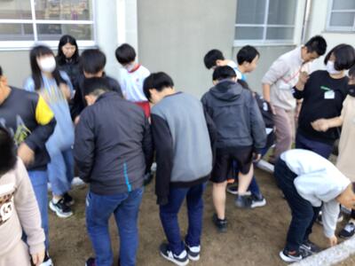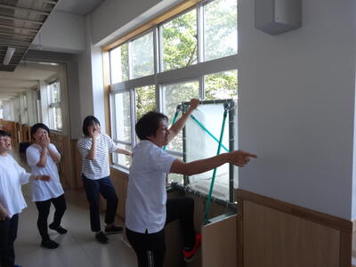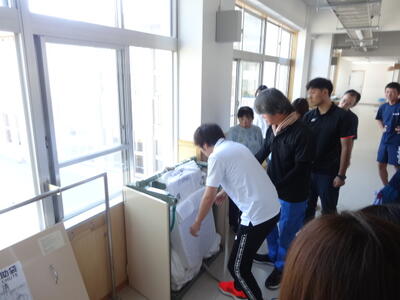 校舎改修とともに3階と4階からの救助袋も設置されました。使いたくはありませんが使い方を知っておく必要はあるため、使用方法の研修会を行いました。