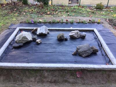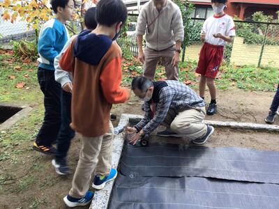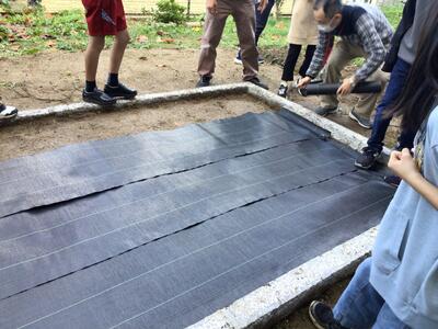 今度は理科クラブの児童が、石庭の基礎となる土台作りに挑戦。畑の一部に囲いをつくってもらったところを固めて防草シートをしきました。次は石を並べます。どんどん倉梯版枯山水の庭に近づきます。