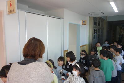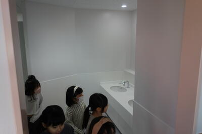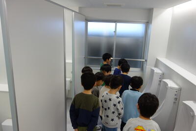 学童横にある、1階のトイレが完成し、今日から使用できるようになりました。早速1年生のみんなが使い方の確かめにきています。「やったあ」「かわいい」「洋式トイレになった」ととてもうれしそう。きれいに使ってね。