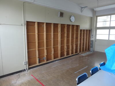 図書室の改修が始まっています。本来は回収対象ではない場所ですが、回収対象の東校舎の旧図書室から移転のため、旧会議室を新図書室にしていただくことになりました。この教室なら少し広めとなり、2つに分かれていた図書室を1つにまとめることができます。この間、6年生と5年生が仮設図書に書架の異動もしてくれました。6月中旬には工事が終わり、再び移動となります。工事の方も一生懸命工事をしてくださっています。